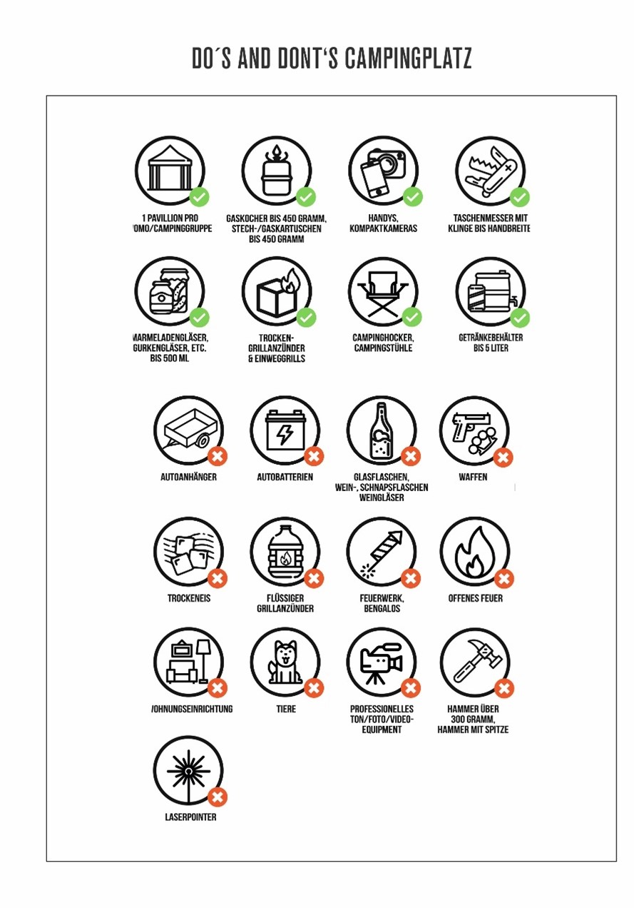 Zutritt zum Campinggelände erhältst du nur mit gültigem Campingpass, welcher gegen ein Bändchen eingetauscht wird. Das Campinggelände ist von Donnerstag um 11:00 Uhr bis Montag 12:00 Uhr durchgehend geöffnet.
